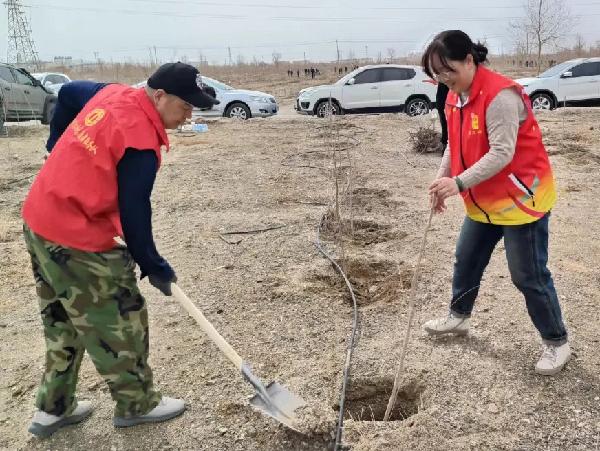 植树现场,党员干部或两人一组,或三人一队,挥锹挖坑、扶树正苗、浇水定根,现场一片繁忙有序、干劲十足的景象。历经3个小时,共植树100余棵,一株株小树错落有致,迎风挺立,焕发出无限生机与活力。
