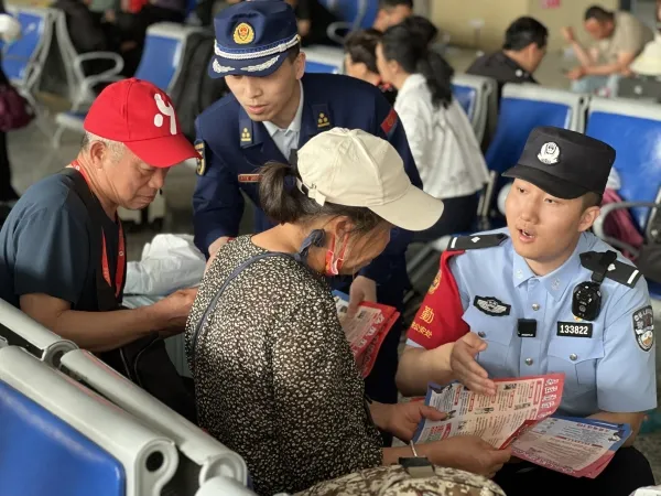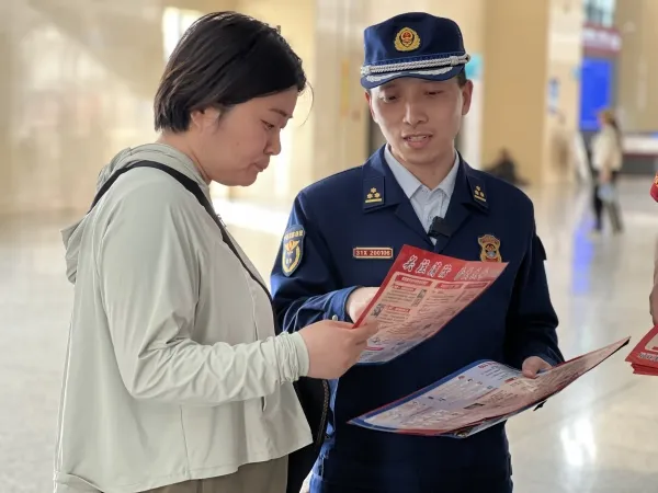 在候车室,防火监督员和车站派出所民警向旅客发放消防宣传彩页,提醒旅客注意出行安全,结合火灾特点讲解乘车防火注意事项。着重讲解火车上火灾事故应对、灭火器使用、正确拨打119火警救援电话等基本消防知识,向群众讲解安全乘车事项,引导群众严格遵守乘车安全管理法律法规,做到文明乘车、安全乘车,现场对群众提出的问题进行耐心解答。