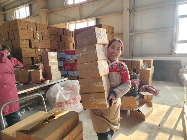 12月12日,库尔勒市阿瓦提乡小兰干村的疆淘农哥仓库里,工作人员正紧张地进行农副产品装箱打包,把优质的农产品送往全国各地。葡萄干、红枣、番茄丁等各类农产品堆满仓库,主播根据粉丝需求,现场详细介绍每款产品。