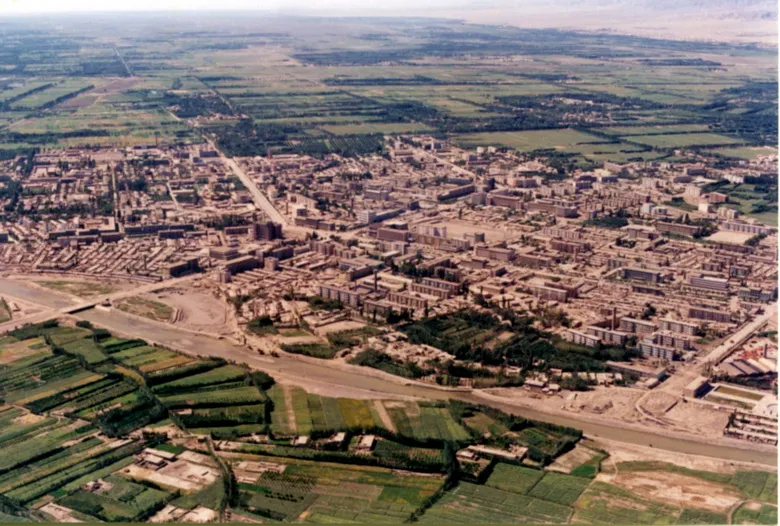 1989年库尔勒市孔雀河北鸟瞰图,现为塔指驻地。(市档案馆 提供)