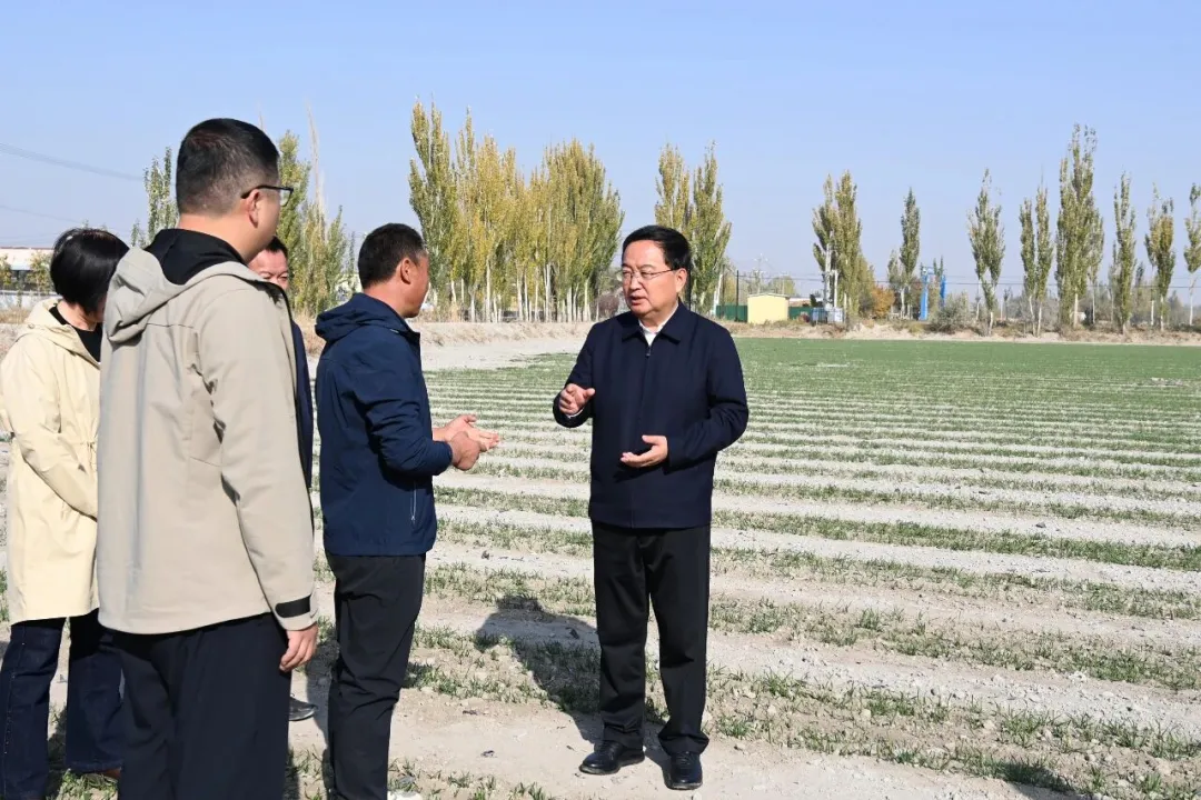 10月28日,州党委书记任广鹏在焉耆县四十里城子镇巴开来村冬麦种植示范田,察看作物长势,了解今年冬麦播种情况。记者 杨晓东 摄