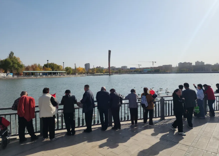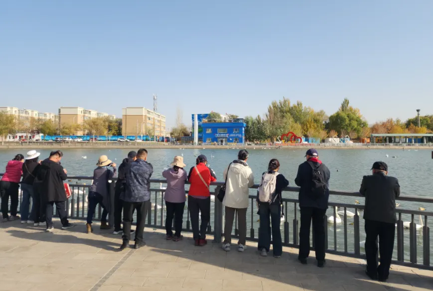10月28日,在杜鹃河彭加木雕像水域附近,成群的天鹅和野鸭等鸟类在河面上游弋、嬉戏,洁白的天鹅与碧水、蓝天、楼宇相映成趣,美轮美奂,吸引了不少市民和游客驻足欣赏,构成一幅自然和谐的生动画卷。重庆游客张清扬说:“第一次来到库尔勒,看到美丽的天鹅,心情都被治愈了,这是大自然的馈赠,库尔勒的自然环境好,才会吸引这么多天鹅来这里过冬。”