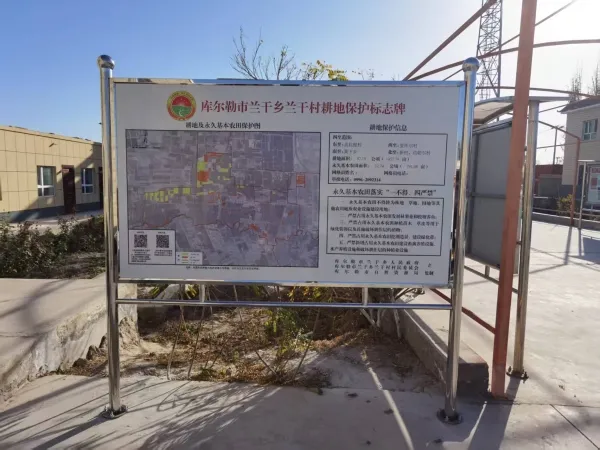 今年11月,首块“库尔勒市耕地保护标志牌”在库尔勒市兰干乡兰干村村民委员会院内安装完成。