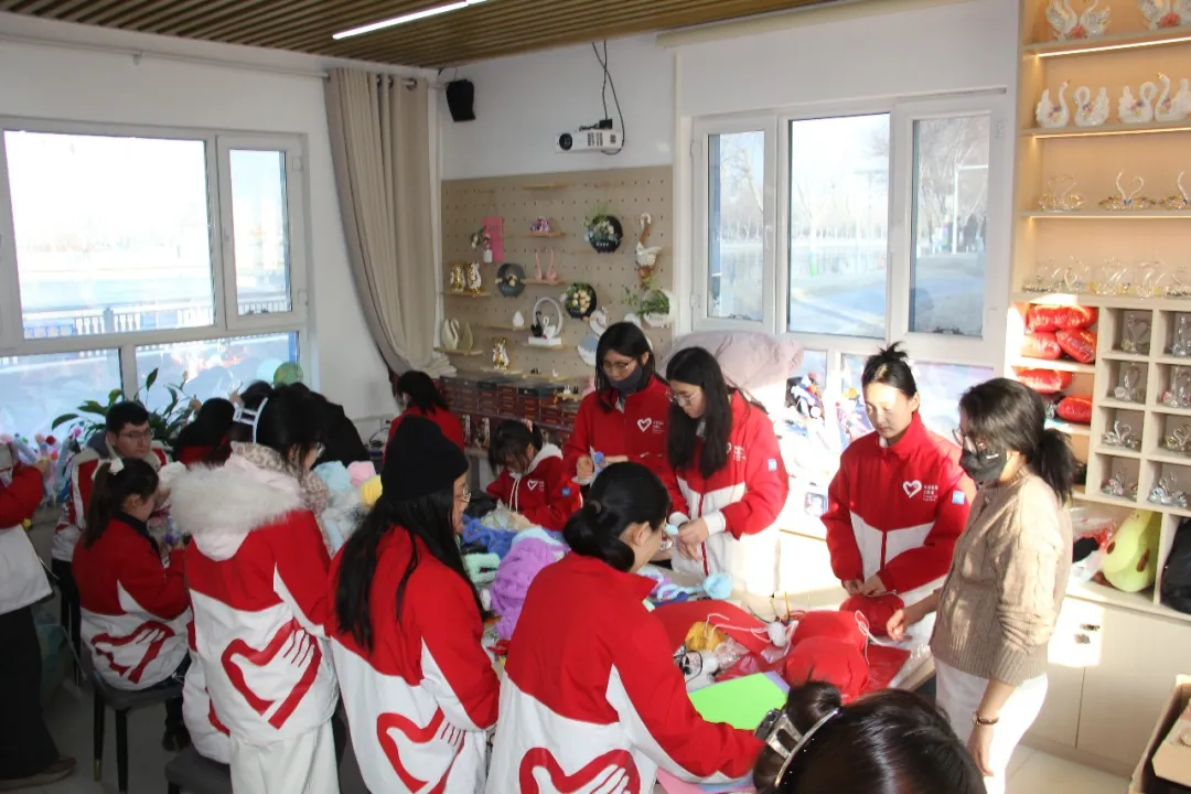志愿者们在天鹅驿站内制作树木的装饰挂饰。