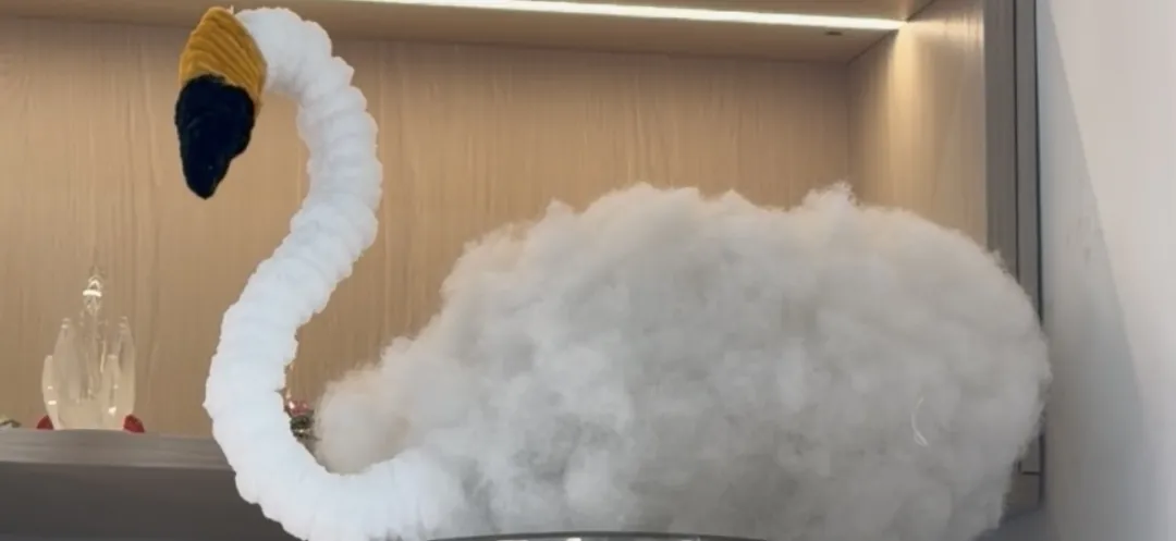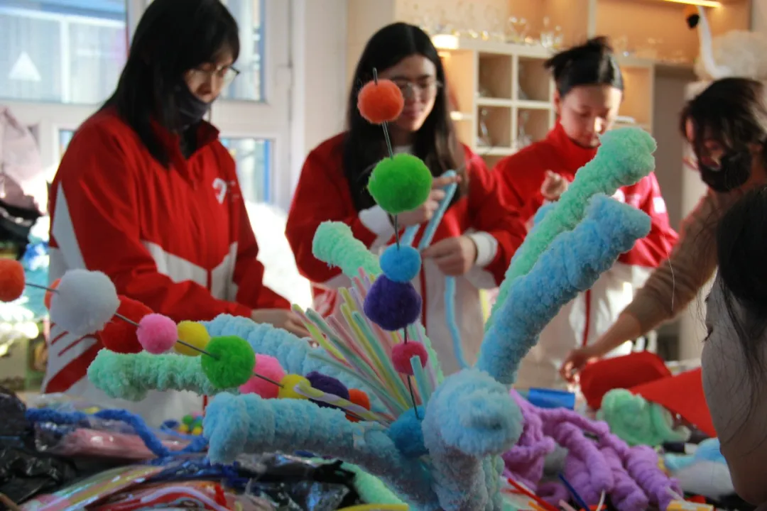 与此同时,天鹅驿站内,志愿者围坐在长桌旁分工制作装饰物。毛线团、布艺材料、绒球、剪刀等工具摆放整齐,大家有的缝制库尔勒香梨造型挂饰,有的用蓝绿渐变毛线缠绕框架制作方形装饰框,并点缀彩色绒球,还有的合作编织烟花造型挂饰。大家边制作边交流设计思路,一件件融合天鹅、库尔勒香梨特色的装饰物陆续完成。