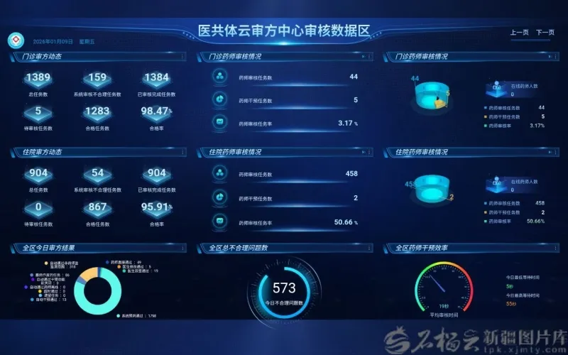 1月9日,库尔勒市紧密型医共体总院云审方中心,AI智能审方系统实时筛查全市24家成员单位处方,大屏清晰展示各类审方数据。杨超龙 摄