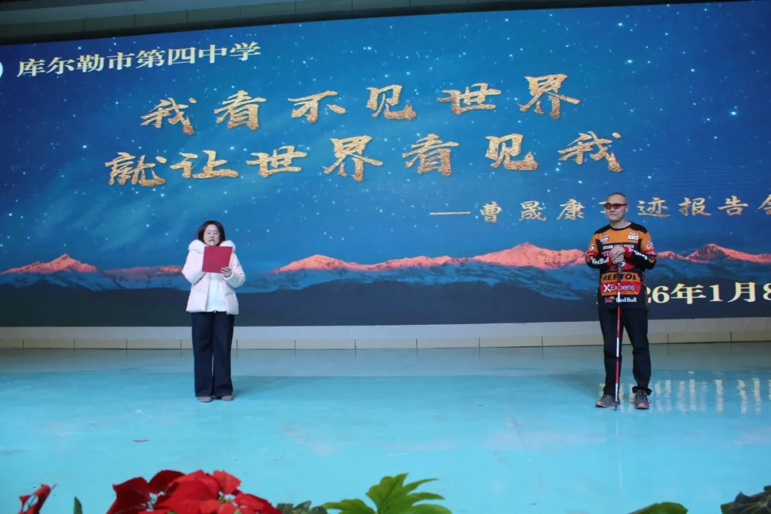 1月8日,库尔勒市第四中学礼堂内暖意融融、掌声阵阵,以“我看不见世界,就让世界看见我”为主题的曹晟康事迹报告会在此举行。库尔勒市多所学校师生代表齐聚一堂,聆听盲人旅行家曹晟康的励志故事,感受直面苦难、勇毅前行的精神力量。