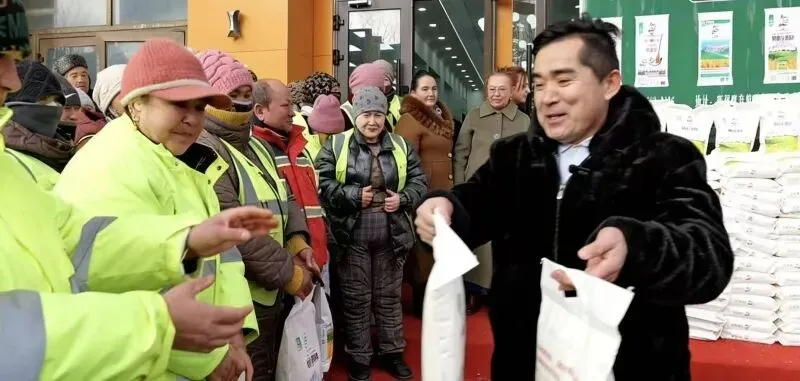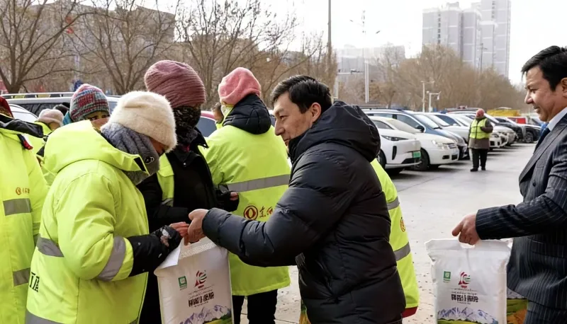 另一边的捐赠现场同样温情满满,一袋袋包装整齐的面粉被有序搬运、分发,环卫工人、贫困户和残疾人员代表依次领取物资。“冬天扫街辛苦,收到面粉心里暖洋洋的,这是对我们工作的认可和关心。”环卫工人们连连致谢,大家也祝店铺生意越来越红火。