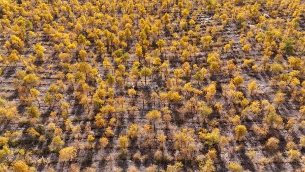 每年秋季,龙山上万亩胡杨渲染出迷人的金色,站在山顶远眺,一望无际的胡杨林如鎏金铺展,与周边山体植被融为一体,勾勒出雄浑壮阔的秋日画卷。这片繁茂的胡杨林,彰显了龙山防护林6万亩生态修复工程以及库尔勒市生态治理的扎实成效。
