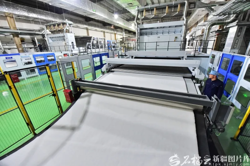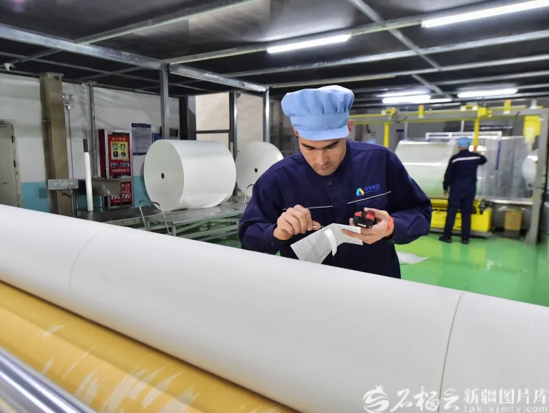 1月13日,工人在位于库尔勒经济技术开发区的新疆中泰亨惠医疗卫材股份有限公司水刺无纺布生产车间作业。