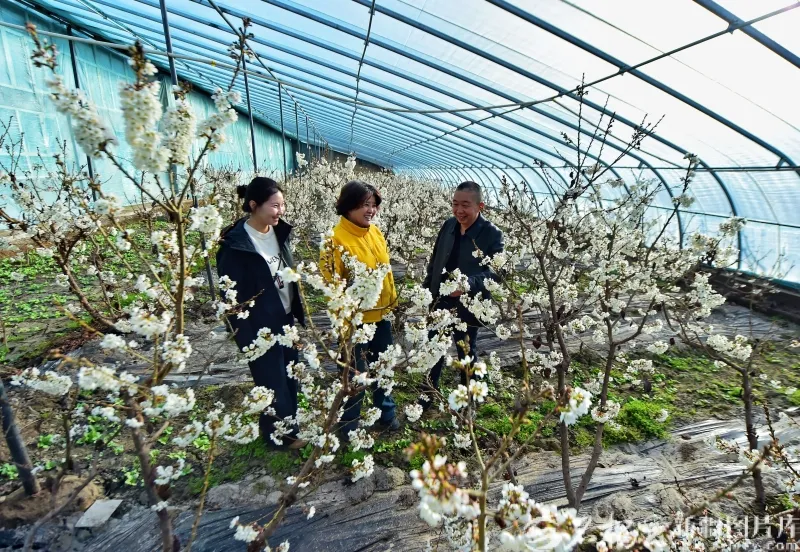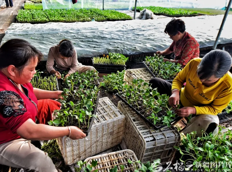 在阿瓦提乡樱桃种植基地,连片大棚内樱桃花竞相绽放,农户抢抓关键期精心授粉,静待硕果满枝。韭菜大棚里,菜农弯腰收割,一茬茬鲜嫩韭菜打捆装车,及时供应节日市场。英下乡草莓基地果香四溢,游客穿梭采摘,尽享田园乐趣;一旁蔬菜育苗棚内,600万株菜苗绿意盎然,农户细心管护,为开春上市做好准备。