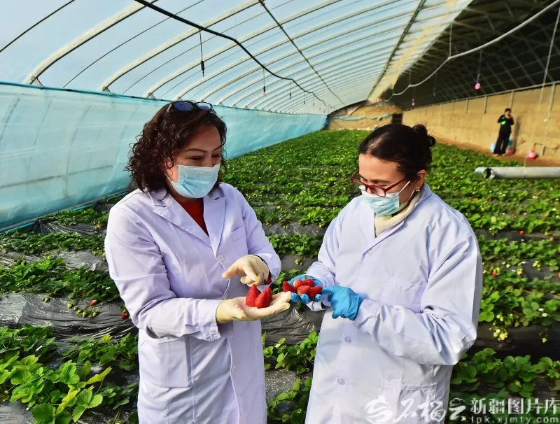 2月10日,库尔勒市农产品质量安全检验检测中心工作人员在英下乡草莓种植基地检测草莓。