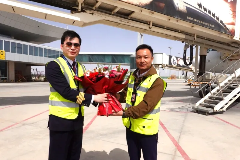 机坪上,机场相关负责人为首航航班机长、乘务长及机组人员献上鲜花,众人拉起横幅,定格这一重要时刻,首航仪式简短喜庆。