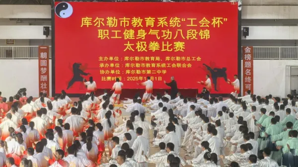 11月1日,库尔勒市教育系统“工会杯”职工健身气功八段锦、太极拳比赛在市第二中学健行馆精彩上演。来自全市各中小学、幼儿园的数十支代表队、共数百名教职工齐聚一堂,以拳会友,共展太极魅力。