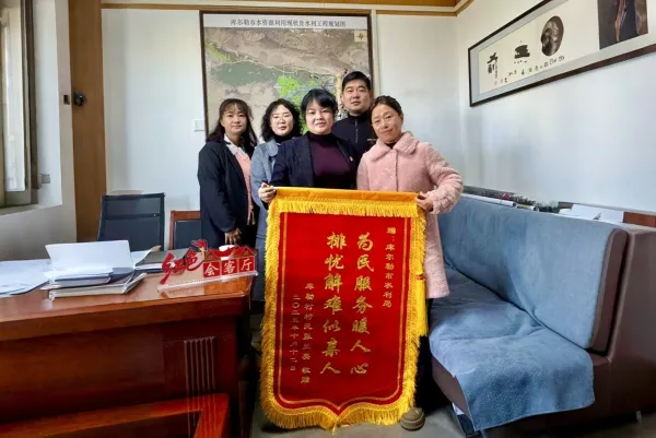 近日,库尔勒市和什力克乡库勒村村民张兰英专程将一面写有“为民服务暖人心,排忧解难似亲人”的锦旗送至市水利局,表达对社办渠防渗改造工程助力她家香梨喜获丰收的感谢。