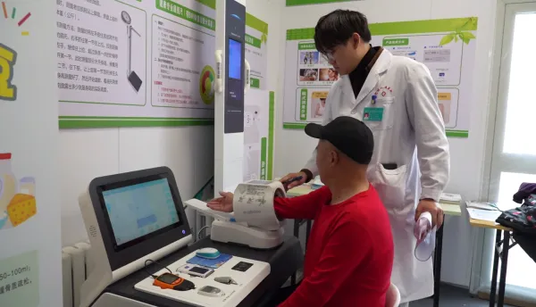 “心跳每分钟112次,有轻微杂音。”杨彦斌对着麦克风说。屏幕那头的专家也迅速给出判断:“可能是早期心衰,立即安排心电图检查。”
