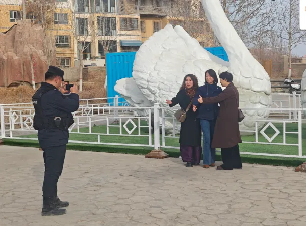“您往左边挪两步,把天鹅和孔雀河的景色都框进去,这样更出片。”2月27日,在杜鹃河畔,库尔勒市公安局特警大队执勤特警正耐心地为来自昌吉的游客调整站位,手中握着游客的手机,反复调整角度后快速按下快门。