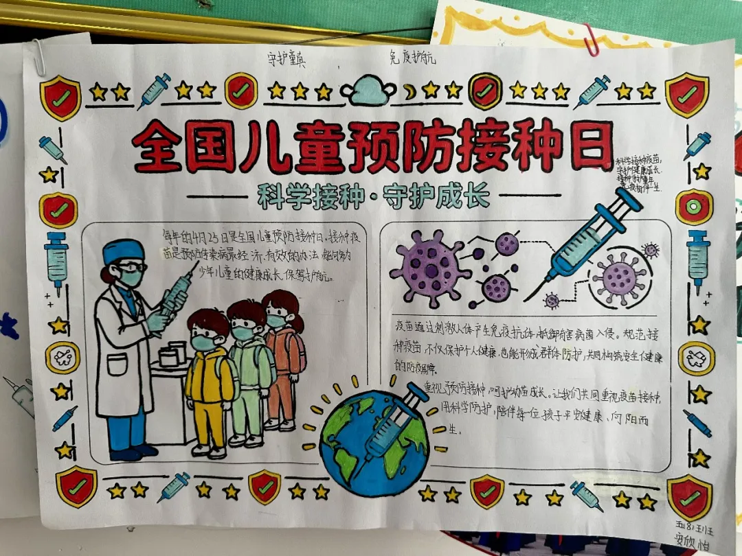 同步开展预防接种主题绘画比赛,面向4至6年级学生征集“疫苗守护健康”“我是健康小卫士”等内容的原创手绘作品。孩子们用画笔传递科学接种、守护健康的理念。经评审组公平评选,共评出一等奖15名、二等奖30名、三等奖45名及纪念奖若干,优秀作品将在校园集中巡展。