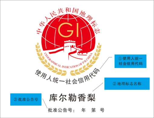 库尔勒香梨外包装常用标识主要分为地理标志专用标志和“库尔勒香梨”地理标志证明商标(注册号:第892019号),两类标识使用需严格遵循以下规范: