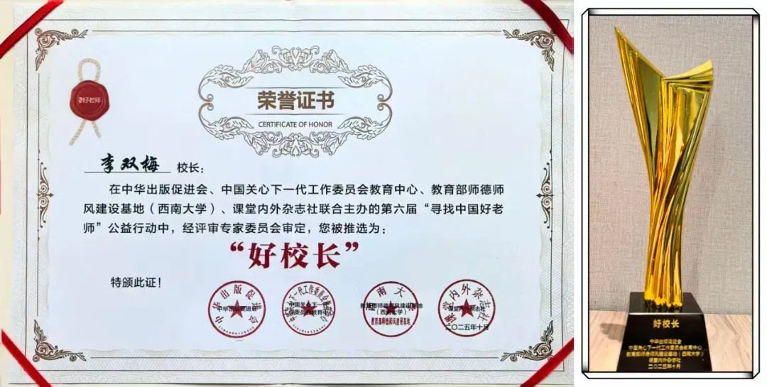 当日,第六届“寻找中国好老师”公益行动颁奖典礼在重庆西南大学举行。会上,库尔勒市第二十三中学党委书记李双梅荣获第六届中国“好校长”称号。作为获奖校长代表,李双梅参加了该活动,并领取荣誉证书和奖杯。