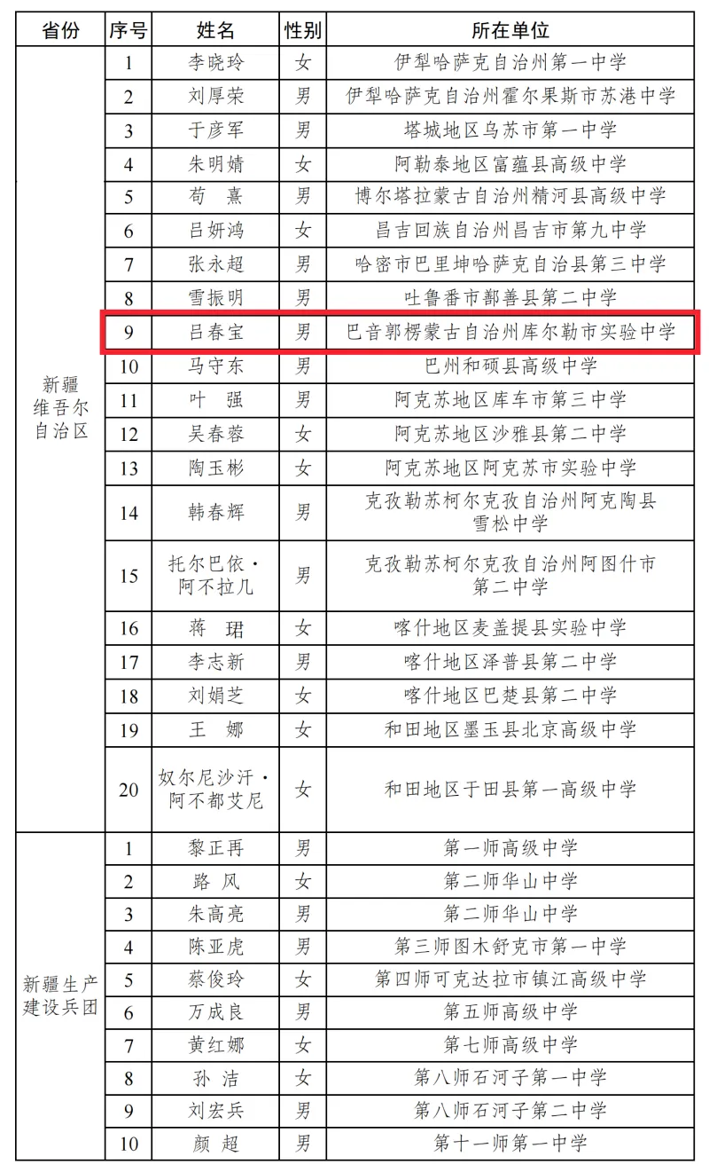 近日,教育部网站公布了首批全国县域普通高中头雁教师岗位计划入选教师名单,共计600人,其中新疆(含兵团)30人(完整名单如下)。