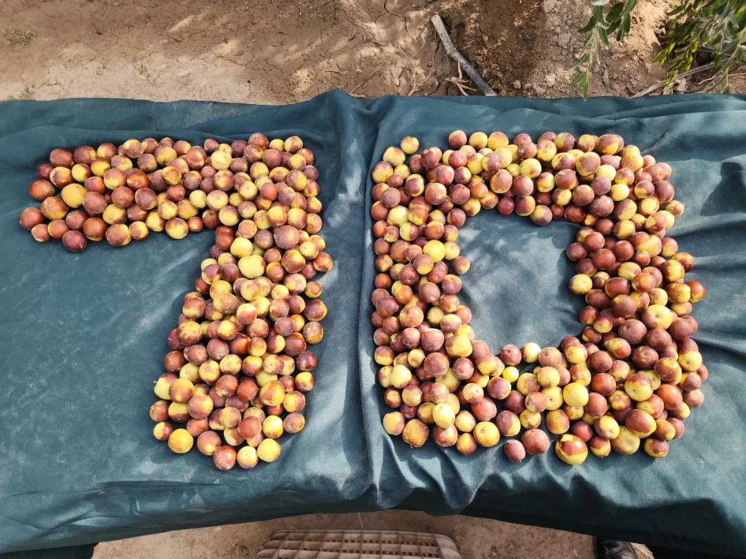 金秋时节,硕果盈枝。9月23日,哈拉玉宫镇中兴社区枣点说果园里,连片冬枣树枝繁叶茂,红彤彤的果实缀满枝头、压弯枝干。果农穿梭林间,忙着采摘、分拣、装箱,脸上满是丰收的喜悦。大家还特意用新鲜冬枣摆出“70”字样,以丰收的喜悦庆祝新疆维吾尔自治区成立70周年,增添浓浓的喜庆氛围。
