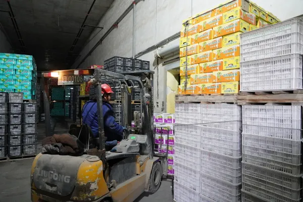 寒意渐浓,库尔勒市阿瓦提乡卡地尔保鲜冷库却暖意涌动。一排排库尔勒香梨包装箱堆叠如山,工人们穿梭其间,分拣、装箱、搬运,忙得热火朝天。冷库负责人地力木拉提·卡地尔说:“咱们的库尔勒香梨既是闯市场的‘金名片’,也是乡亲们的‘增收果’。”