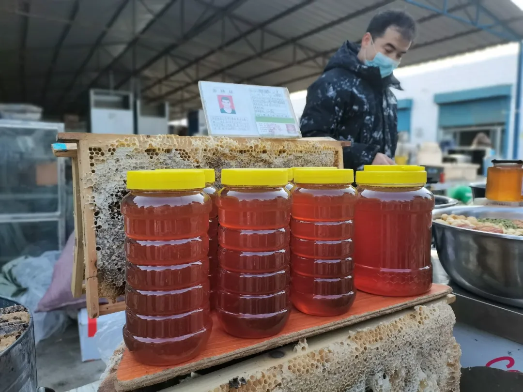 村民在恰尔巴格乡百姓大巴扎售卖自家生产的蜂蜜。