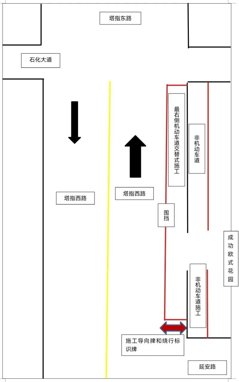 塔指西路前往石化大道方向最右侧直行车道及与石化大道交叉口红绿灯下原右转车道封闭、邻近直行车道变为直行与右转车道,所有需途经该路段的车辆与行人,请缓慢通行。