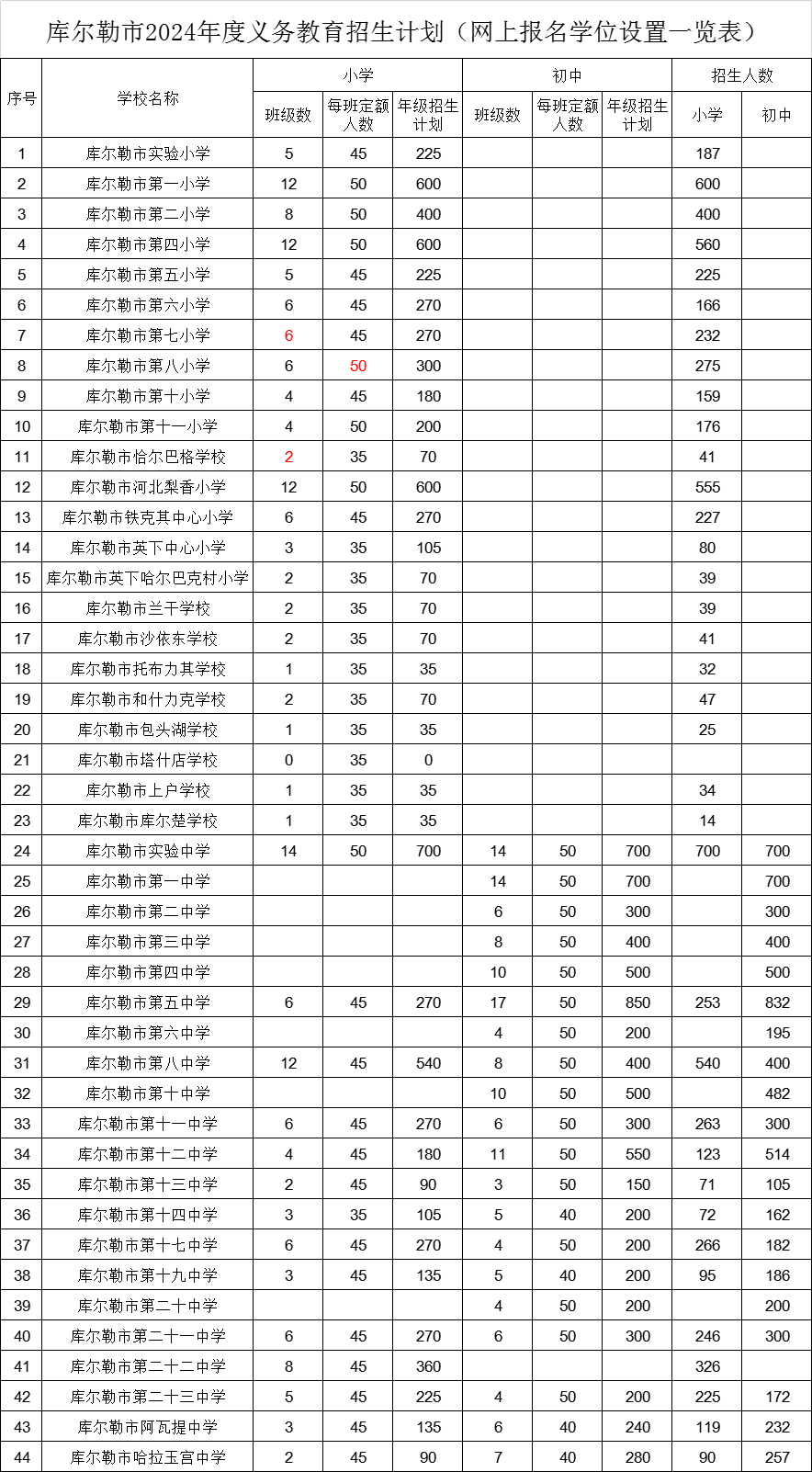 库尔勒市2024年度义务教育招生计划(网上报名学位设置一览表)