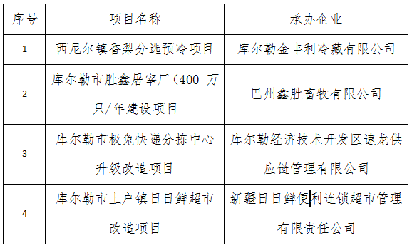 根据《财政部办公厅商务部办公厅国家乡村振兴局综合司关于支持实施县域商业建设行动的通知》(财办建〔2022〕18号)、《商务部等9部门办公厅(室)关于印发〈县域商业三年行动计划(2023-2025年)〉的通知》、《自治区商务厅<关于组织开展2025年支持实施县域商业建设行动项目申报工作的通知>》等文件要求,库尔勒市商工局开展了2025年县城商业建设行动项目初选工作。按照公平、公开、公正的原则,经向社会宣传、企业自主上报、政策解读,初步审核确定库尔勒市极兔快递分拣中心升级改造项目等4个项目为库尔勒市2025年度县域商业建设行动项目,现予以公示。公示时间为5个工作日,如有异议,请与库尔勒市商务和工业信息化局联系。