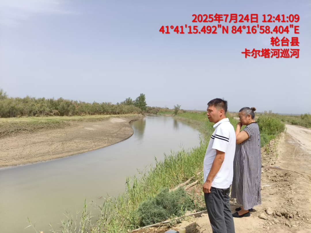 轮台县草湖乡河长对卡尔塔河进行巡河。