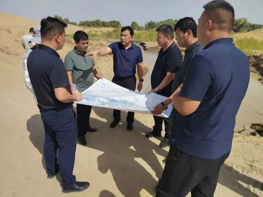 博湖县副总河(湖)长、张永锟副县长带领水利局局长、应急管理局局长等一行人,前往博湖县博斯腾湖乡布尔冬散勒沟(2)号山洪沟现场巡查。