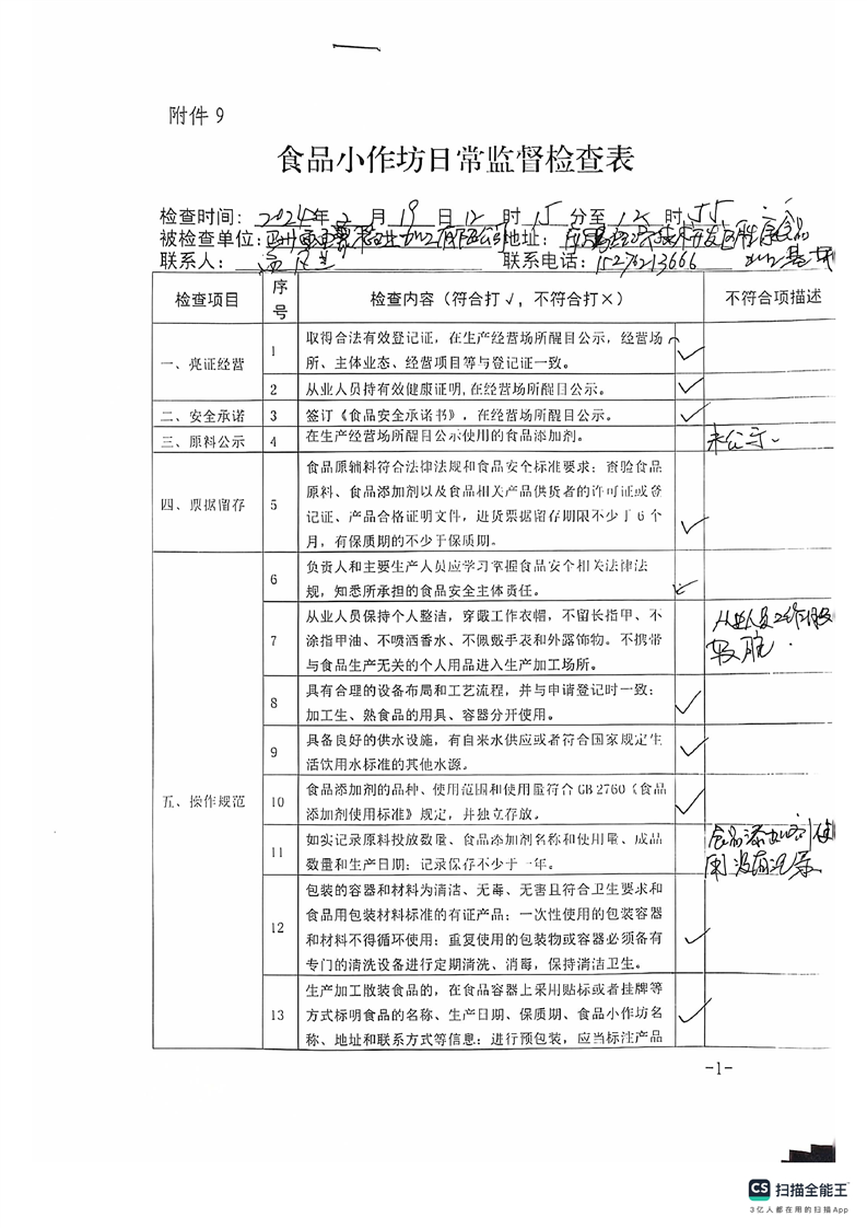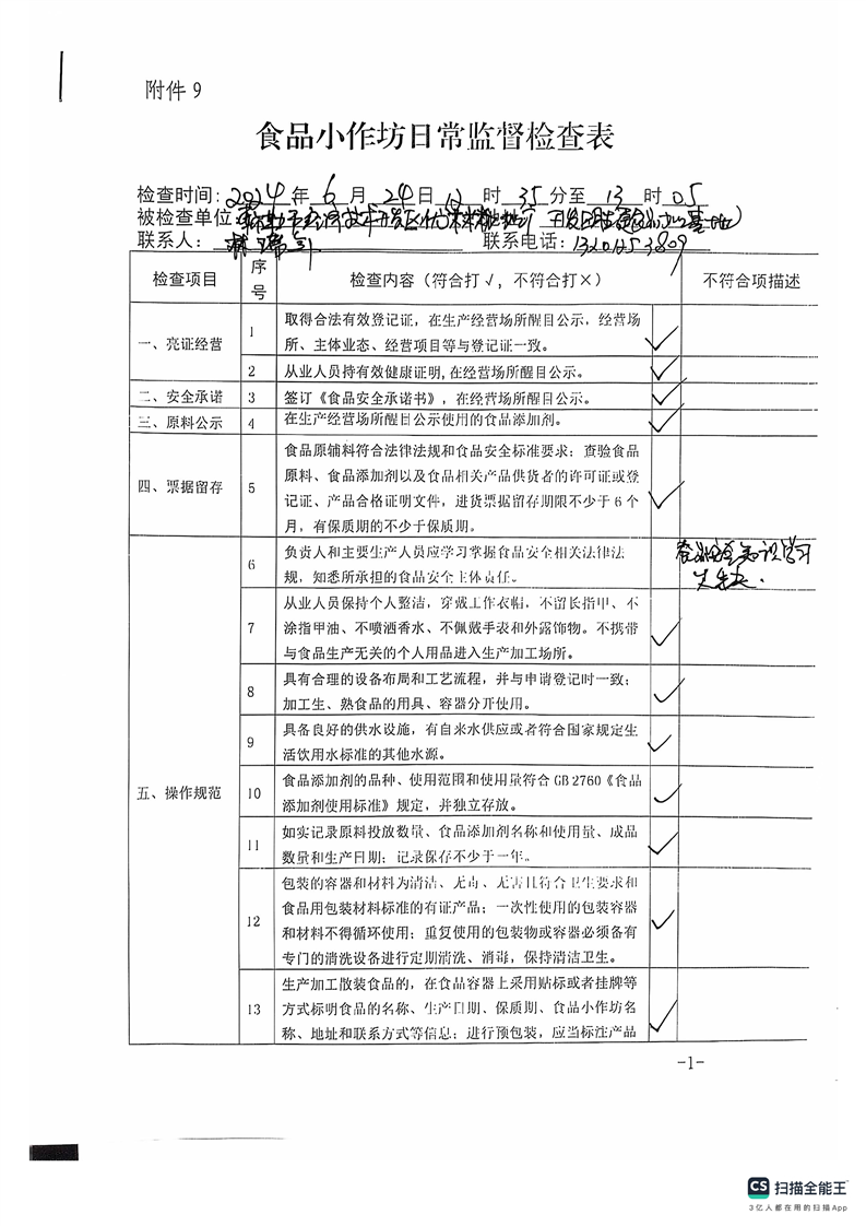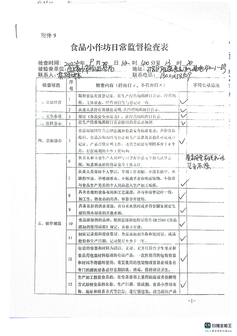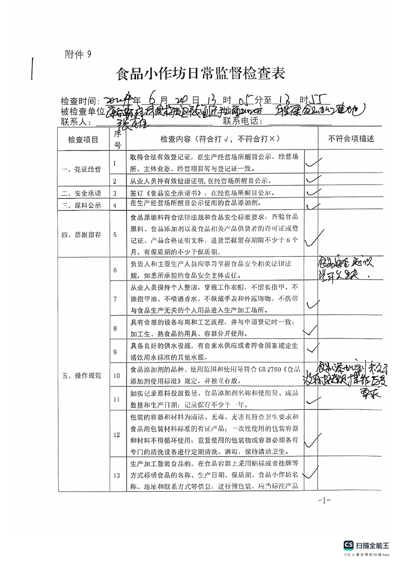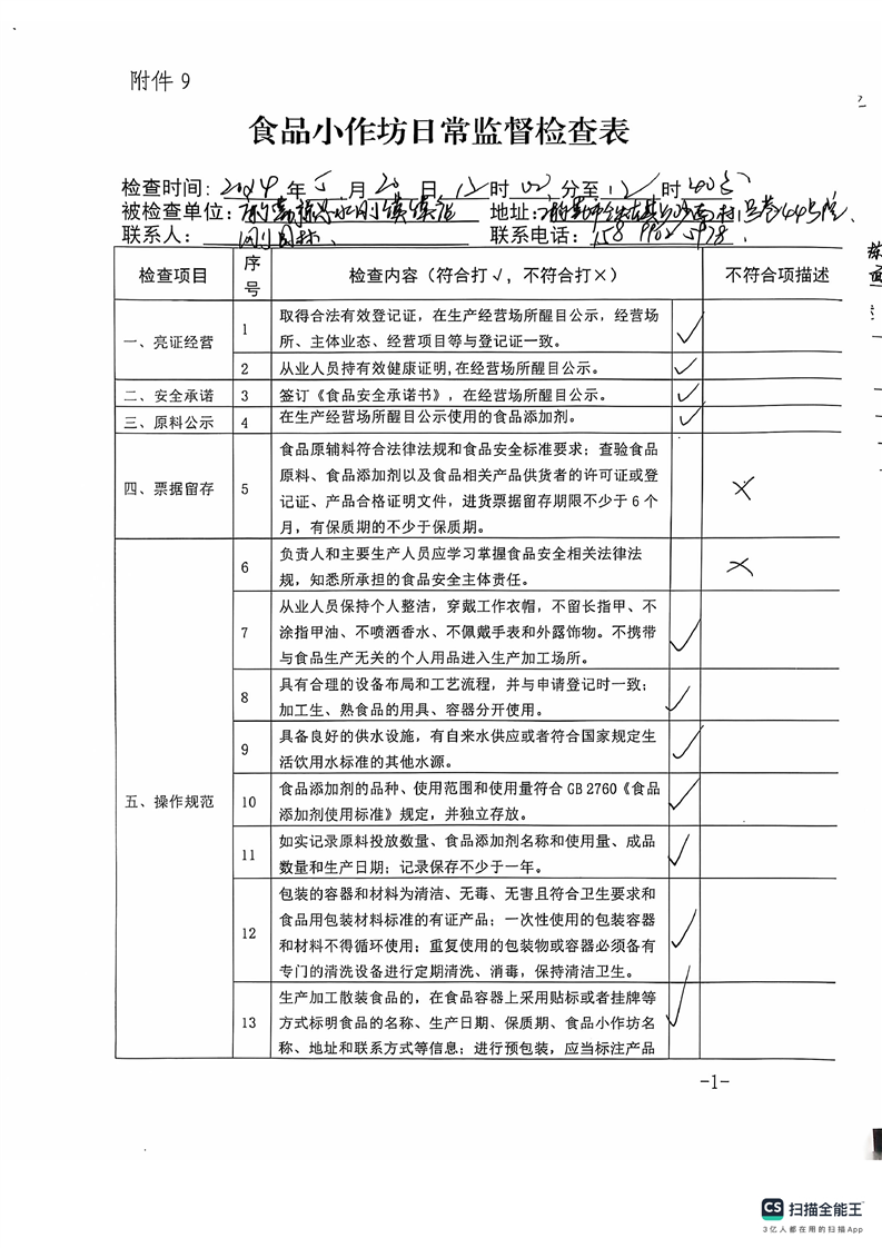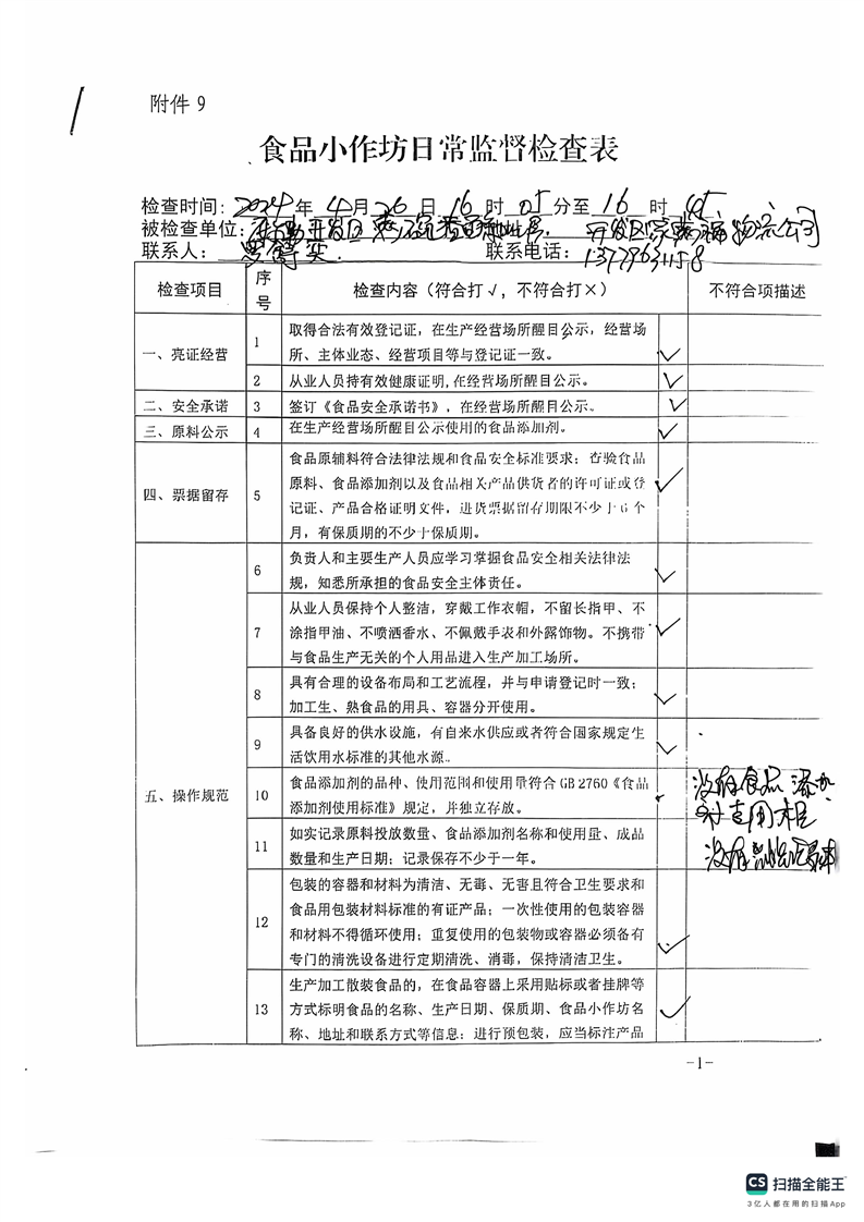 2024年库尔勒市食品小作坊日常监督检查表