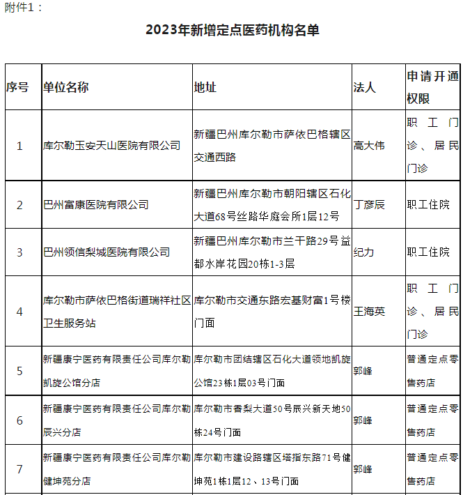 附件1:2023年新增定点医药机构名单