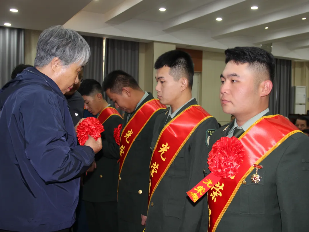 现场为11名退役士兵佩戴印有“光荣退伍”的红绶带与红花,当绶带披身、红花映胸时,退役士兵的脸上洋溢着自豪与喜悦。随后,退役士兵代表上台发言。