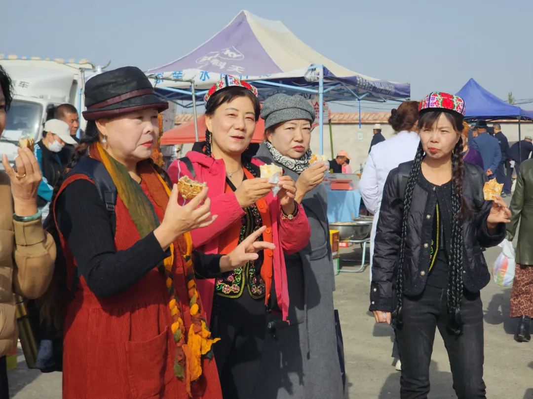 另一边,烟火气中藏着产业的活力。200余家摊位陈列着瓜果蔬菜、农副产品、特色小吃等琳琅满目的商品,村民、市民和游客开启“逛吃选购”模式。“我今天带了一些蔬菜在这里卖,最近活动多、人多,生意很不错。”摊贩吉力力·哈力克的笑容里满是喜悦。