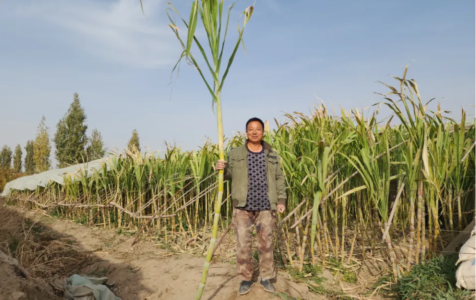 这片甘蔗的种植户是兰干乡新村党支部书记范永安。今年,他敢为人先,带头试种甘蔗,在西北的戈壁绿洲上,细心呵护着这些来自远方的“甜蜜客人”。从选种、育苗到日常管护,每一个环节都倾注了他大量心血。如今,看着长势喜人的甘蔗,他心里的石头终于落了地。