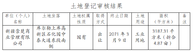 现将库尔勒市自然资源局对库尔勒上库高新区一宗土地登记审核结果予以公布(详见附表),若对公布的土地使用权等有异议者请于2026年4月3日前,到上库高新区自然资源局受理窗口申请办理复查手续,逾期没有提出异议的即认为上述公布的权益有效,将准予登记注册。
