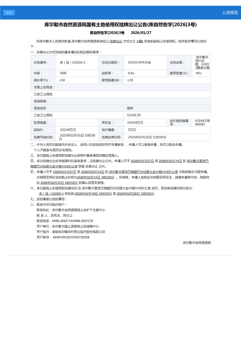 新疆库尔勒市国有建设用地使用权出让公告库自然告字[2026]3号