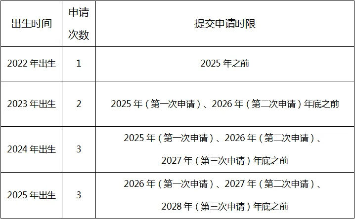 2.未在规定年度内提出申请的,视为自动放弃当年申请资格(具体申领时限详见下表)。后续年度的育儿补贴可继续在规定年度内提出申请。
