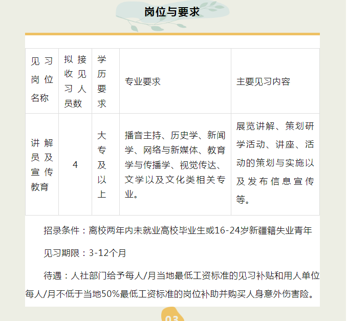 为深入贯彻落实国家及自治区关于促进青年就业的决策部署,帮助教育领域青年提升就业能力、尽快实现职业启航,库尔勒民俗文化博物馆精心筹备一批见习讲解员岗位,现面向社会公开招募4名见习讲解员!