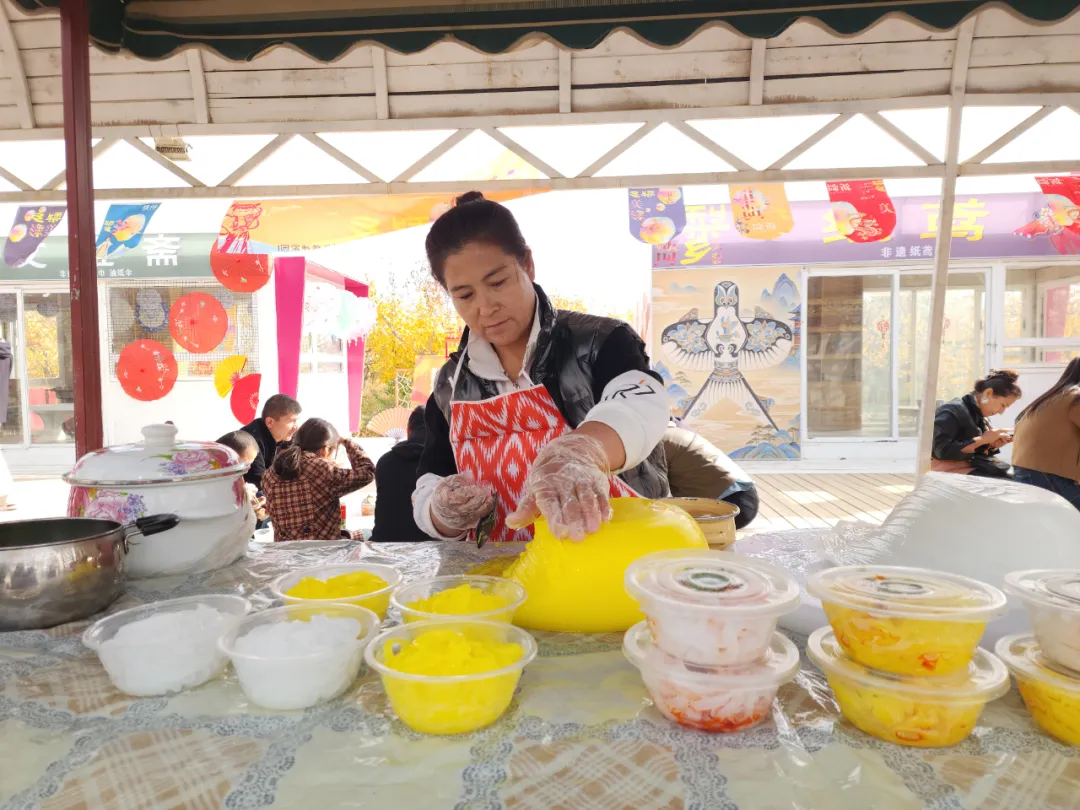 除了丰富的体验项目,现场还设置农副产品销售区和特色美食展位。库尔勒香梨、新鲜的葡萄等本地特产琳琅满目,前来选购的游客络绎不绝;美食区,抓饭、凉粉、手抓肉等应有尽有,让游客在体验文化的同时尽享味蕾盛宴。丰富多彩的文艺展演,为现场增添了更多欢乐的氛围。