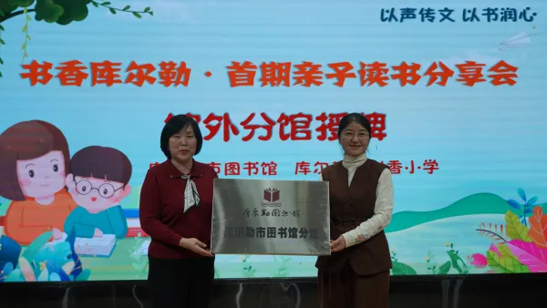 现场向库尔勒市梨香小学授予“图书馆馆外分馆”牌匾,推动馆校合作共建,为书香校园建设注入新的活力。