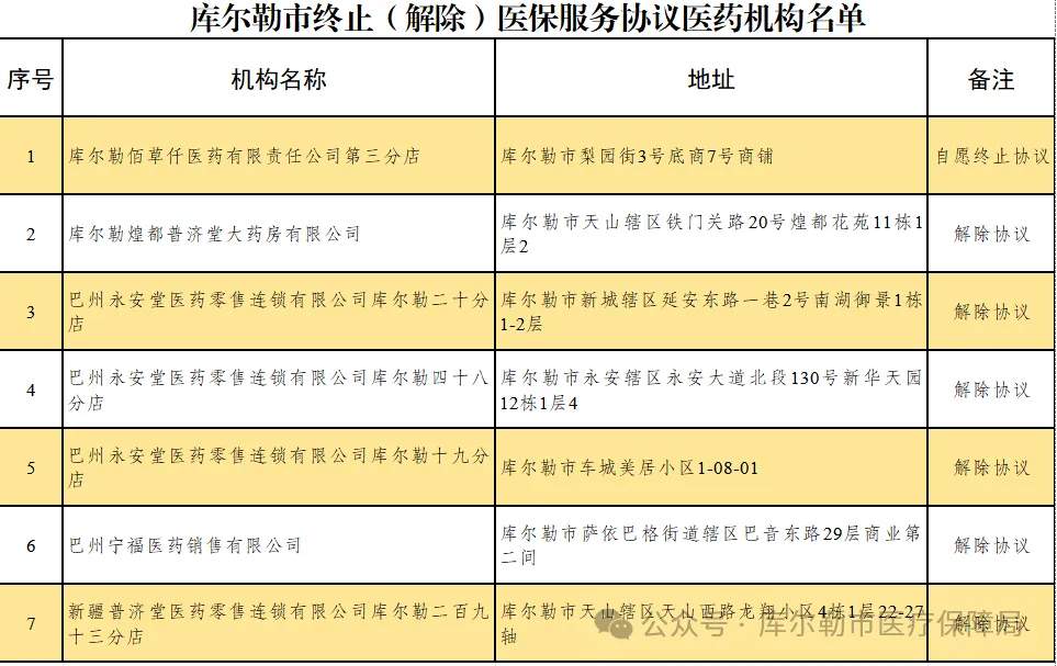 为进一步加强定点零售药店协议管理,维护医保基金安全,按照《零售药店医疗保障定点管理暂行办法》(国家医疗保障局令第2号)有关规定及零售药店医保服务协议约定内容,库尔勒市医疗保障局经会议研究决定终止(解除)7家定点零售药店医保服务协议,现将具体医药机构名单予以公布。