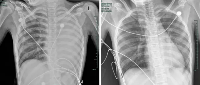 治疗前后影响对比,左肺从“白肺”到正常状态。