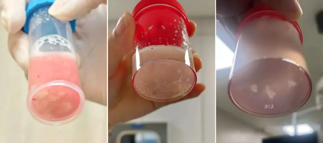 从左至右分别为三次支气管镜取出的塑型,第3次塑型明显减少,灌洗液也比之前清亮。