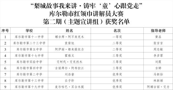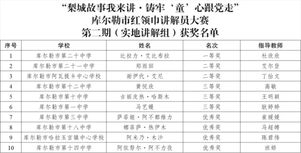 本次大赛由库尔勒市委组织部、市委宣传部、市委统战部联合主办,市教育局、市团委、市少工委、市关工委承办。本次活动既是对前期“梨城红领巾讲解员”研学实践成果的集中检验,还创新设置“主题宣讲+实地讲解”双赛场。来自全市19所中学的少先队员同台竞技,以青春之声讲述梨城故事,用赤诚之心传承红色基因。