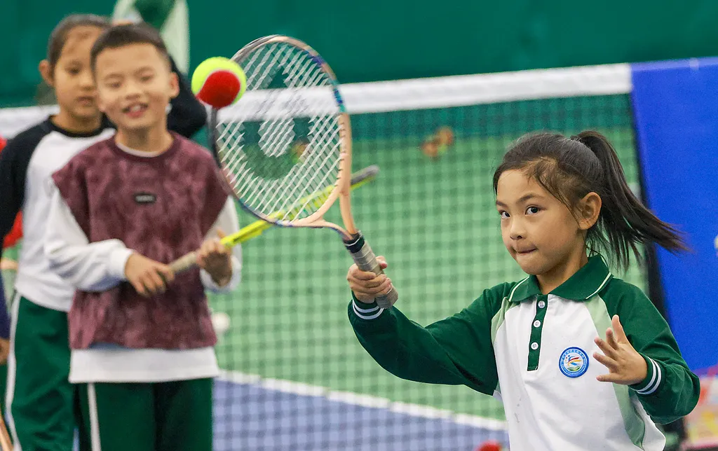 △内蒙古鄂尔多斯市伊金霍洛旗实验学校的小学生在体育课上练习网球。