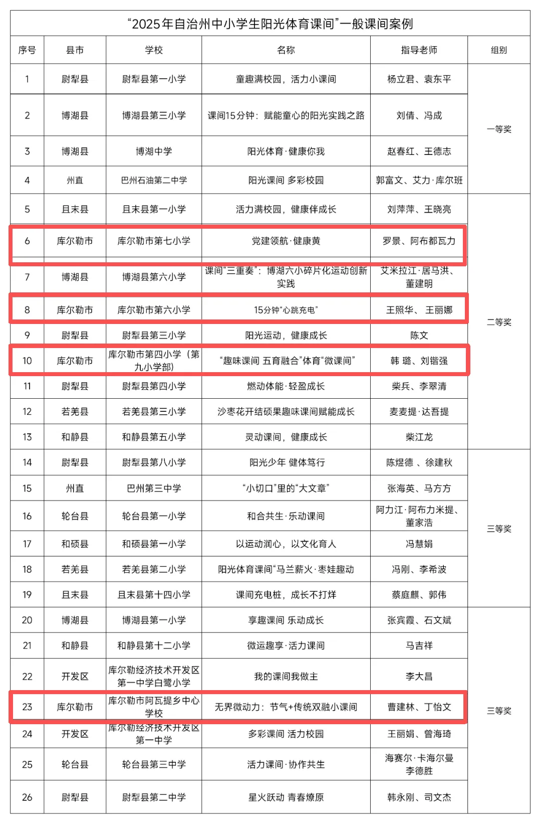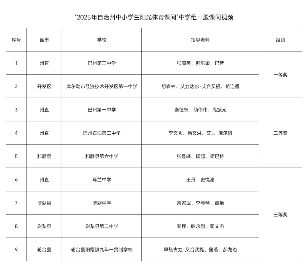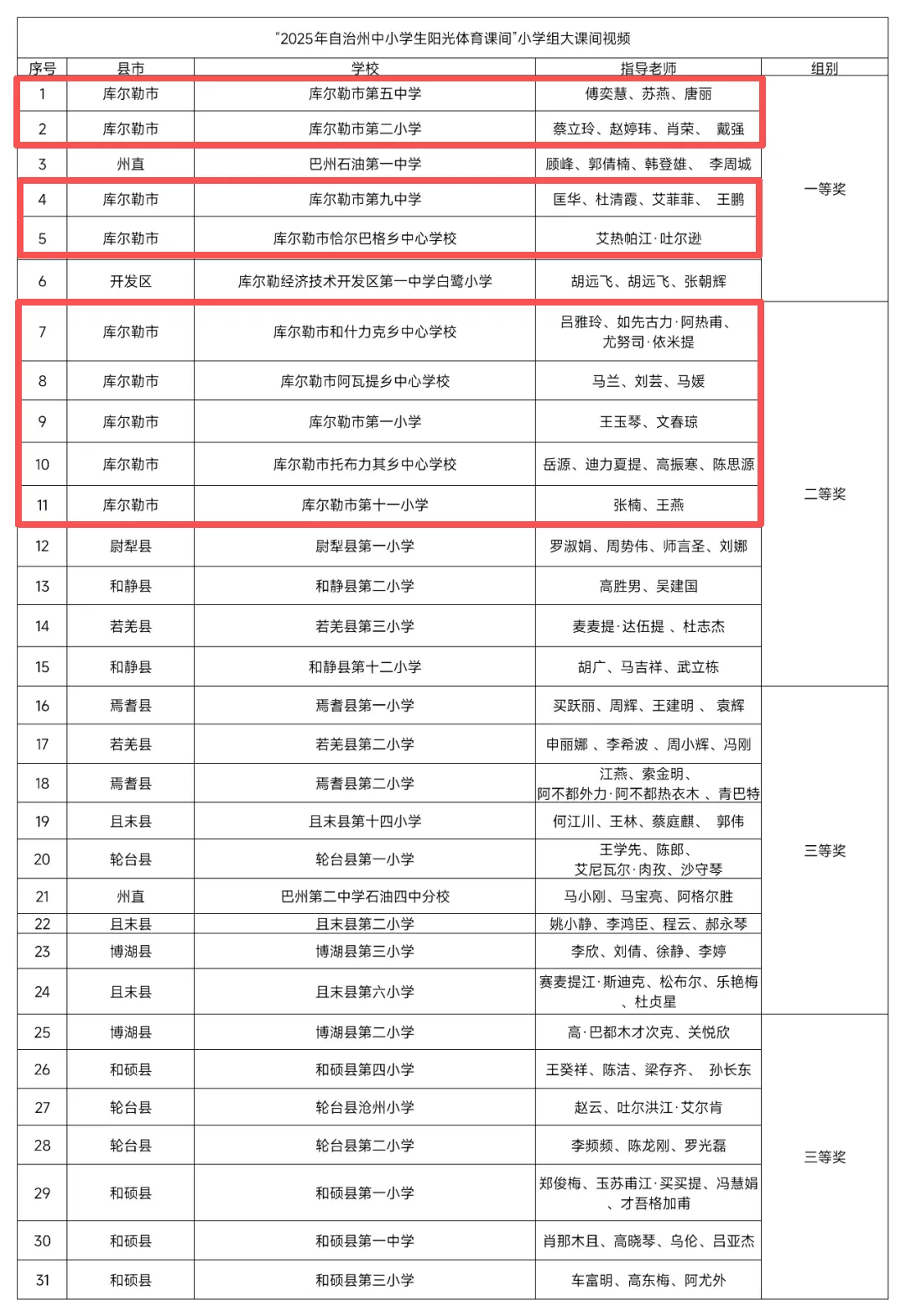 为深入贯彻落实国家、自治区《关于全面加强和改进新时代学校体育工作的意见》、自治区教育厅等四部门《关于印发〈自治区强化学校体育促进学生健康发展行动方案〉的通知》(新教厅〔2023〕103号)精神,丰富巴州中小学课间体育活动形式,全面提升中小学生体质健康水平,促进学生身心健康发展,2025年10月—12月,州教育局组织全州各中小学校开展“2025年自治州中小学阳光体育课间”评选活动。经各县市及州直中小学、各县市教科(育)局层层评选,共报送123个阳光体育课间视频作品及97个阳光课间案例参加州级评选,通过评审,最终有146个优秀作品在自治州级评审中获奖,其中,一等奖27个,二等奖47个,三等奖72个(详见附件1),评选出“优秀组织单位”7个,“优秀组织个人”8人(详见附件2)。